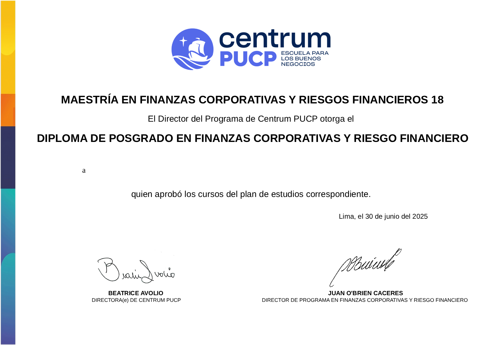 La Maestría en Finanzas Corporativas y Riesgo Financiero de Centrum X está diseñada para formar profesionales con visión estratégica y capacidad analítica para tomar decisiones financieras que generen valor sostenible en las organizaciones. Este programa aborda integralmente áreas como análisis financiero, gestión del riesgo, valorización de empresas y cumplimiento de estándares internacionales.