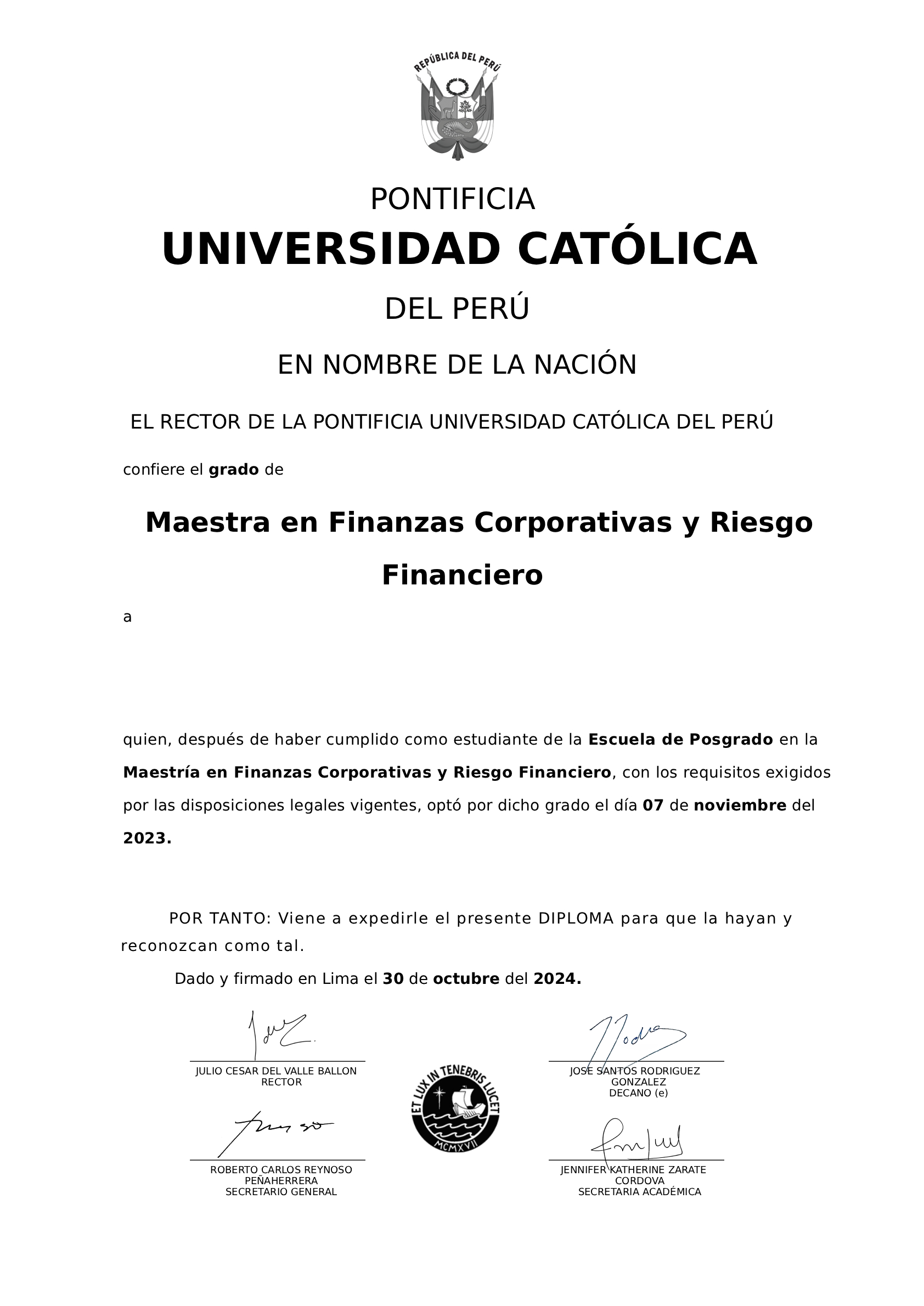 Otorgado por la Pontificia Universidad Católica del Perú (PUCP), modalidad a distancia. Este grado oficial garantiza una formación de excelencia, alineada con los estándares académicos más altos.