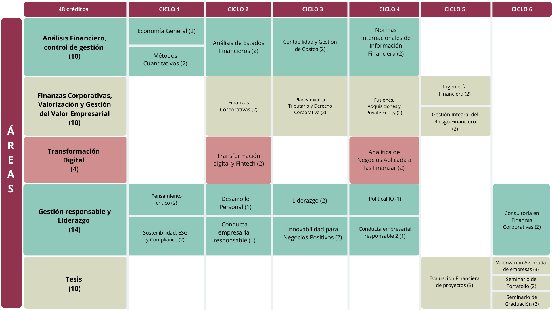 Los cursos se distribuyen en seis ciclos progresivos, permitiendo a los estudiantes construir una base sólida en finanzas y avanzar hacia temas especializados y de alto impacto para liderar con éxito en entornos financieros complejos.